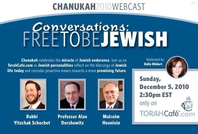 On Sunday, December 5th – 28th Kislev, Torah Café will be airing its 6th webcast, entitled “Conversations: Free to be Jewish.”