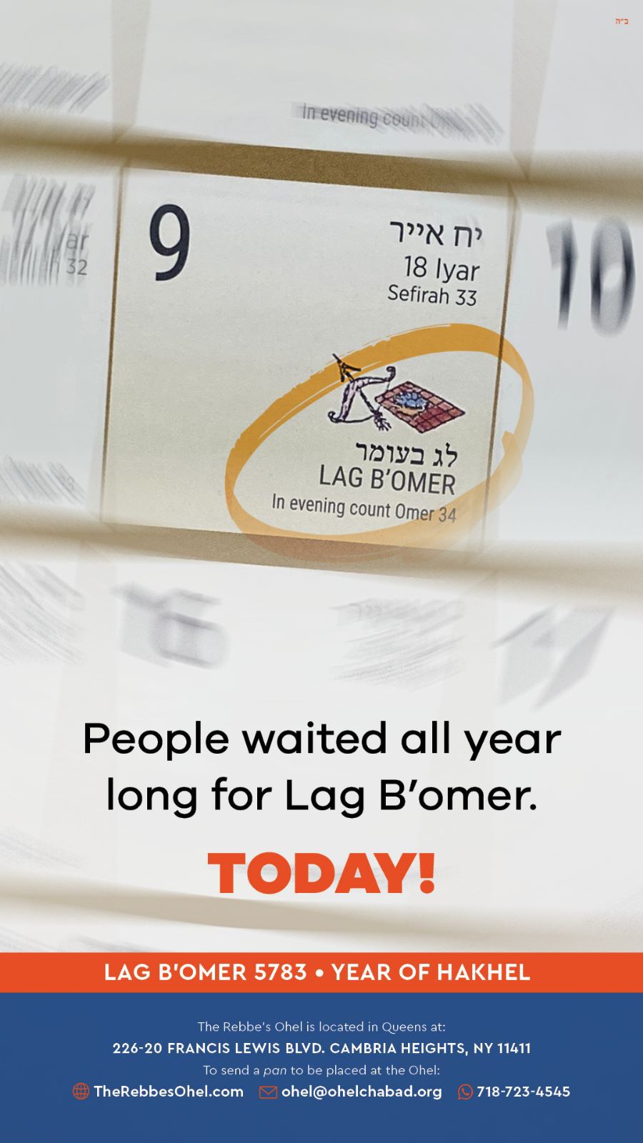 Seizing the opportunity of this auspicious day, and to allow for as many people as possible to visit the Rebbe’s Ohel, multiple buses will be shuttling the eager crowds to and from 770 and the Ohel, beginning Monday, 17 Iyar, throughout Tuesday, Lag B’omer, at a subsidized price of $7 round-trip (or one-way). Men, women, and children are invited without registration.