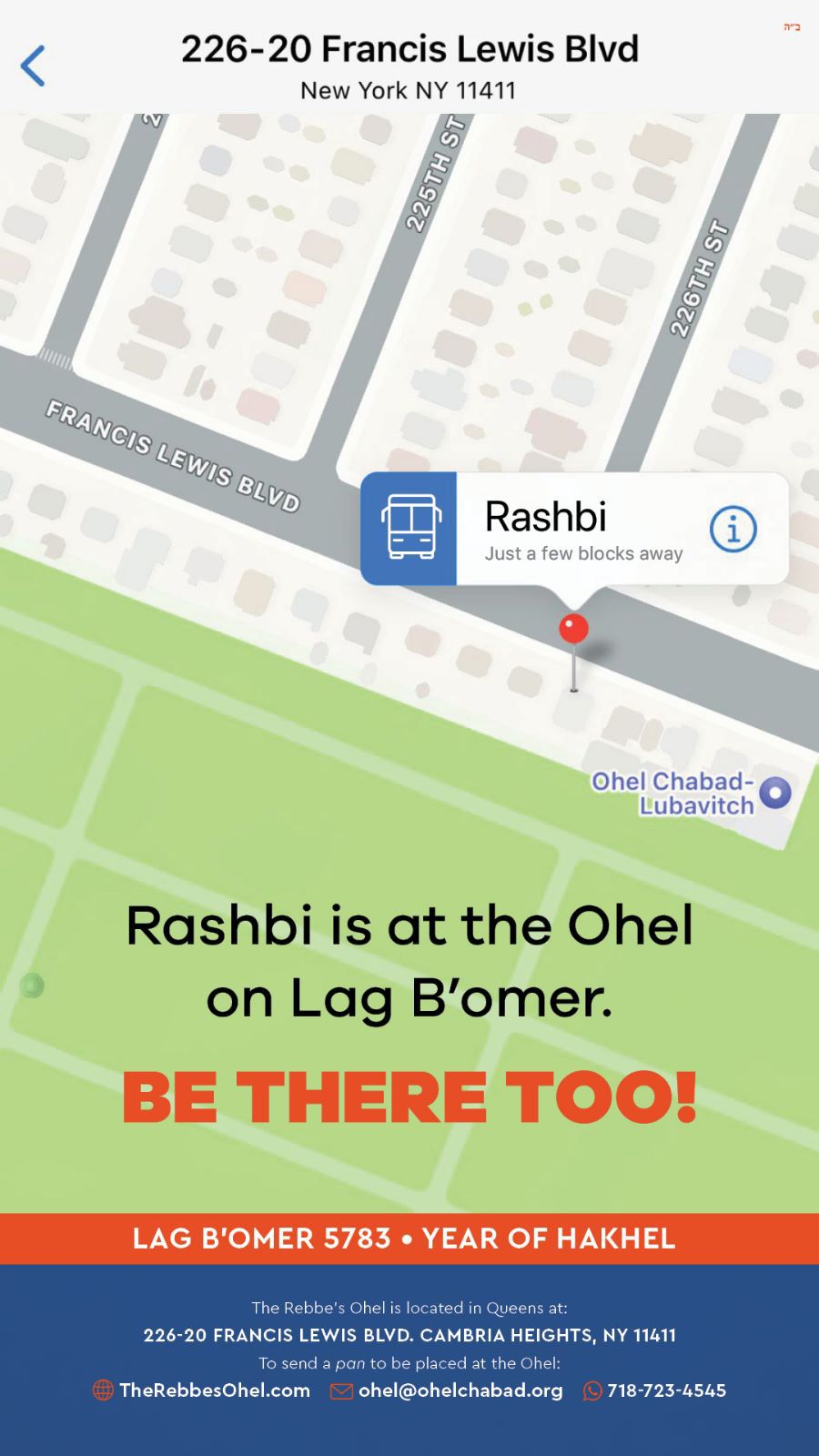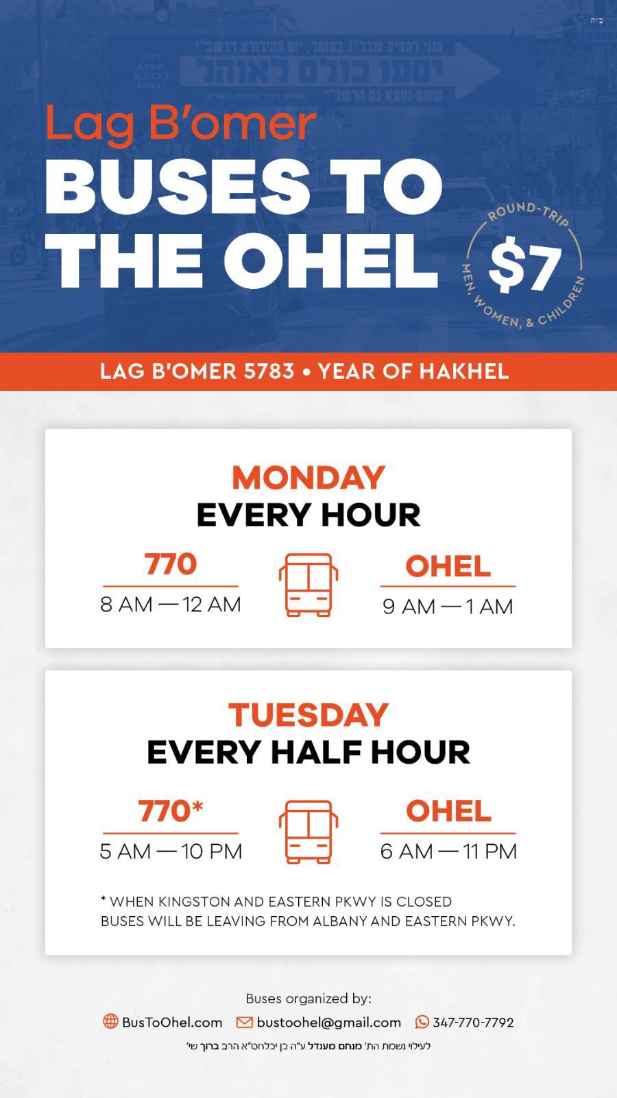 - From Ohel: Every hour from 9 AM to 1 AM.