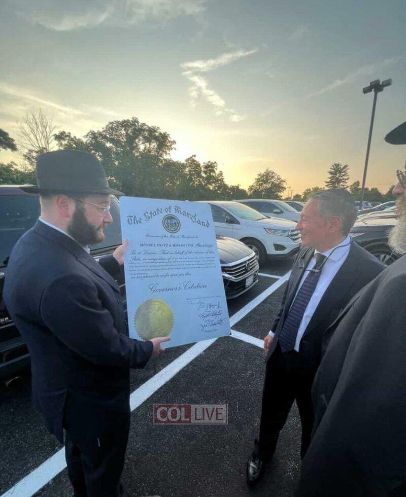 It was presented by Deputy Secretary of the State of Maryland Luis Borunda, who has been of great assistance in the past to many Shluchim, and is a friend of Head Shliach of Maryland Rabbi Shmuel Kaplan.