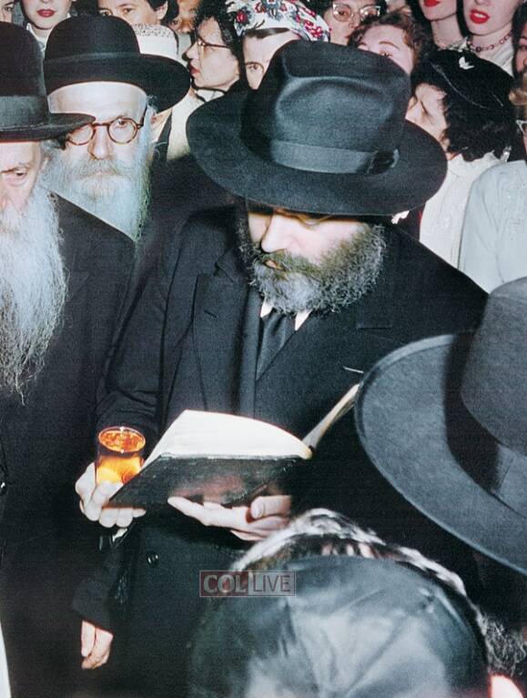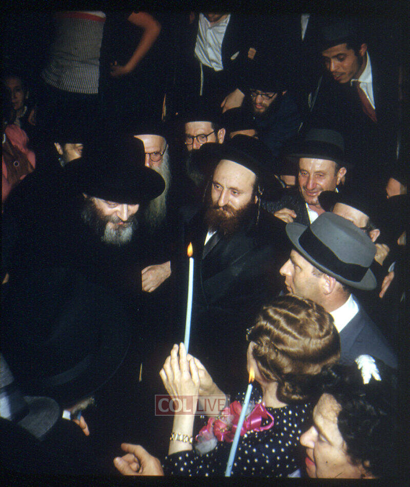 Two rows of dignitaries with candles in their hands formed a pathway for the Chosson, accompanied by the Rebbe and his uncle, Rabbi M. Horenstein. After the Chosson reached his place, the Kallah was brought in as well, accompanied by her mother, her grandmother, and her great-aunt, Mushka. The Rebbe ordered the singing of the Alter Rebbe’s Niggun of Four Stanzas during the walk to the chupah, and the Rebbe himself sang along as well.