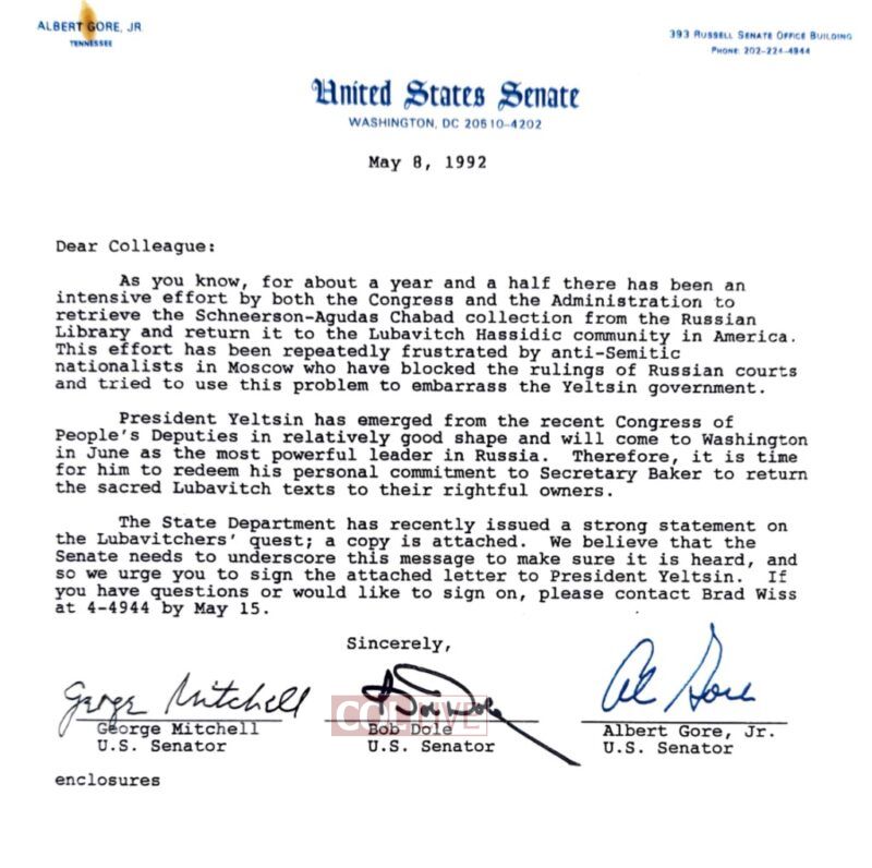 Even before winning the election, Clinton and Gore signed a letter to Rabbi Shlomo Cunin expressing their support for the cause. “A Clinton/Gore Administration will support your efforts to secure the return of the Schneerson-Agudas Chabad texts,” they wrote on September 12, 1992.