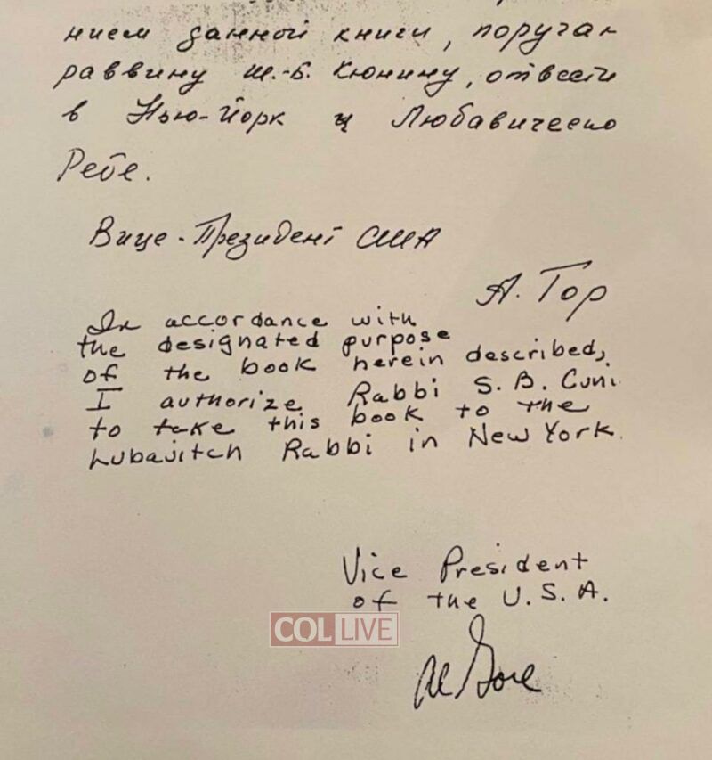 Gore presented Rabbi Cunin with the rare edition of the Tanya that he received from the Russians. “I know how the Russians work,” the vice president said. “So to ensure that you make it through Russian Customs, I wrote a brief letter in the book, both in Russian and English, using my Vice Presidential power, authorizing you to take the Tanya to Rabbi Schneerson in Brooklyn.”