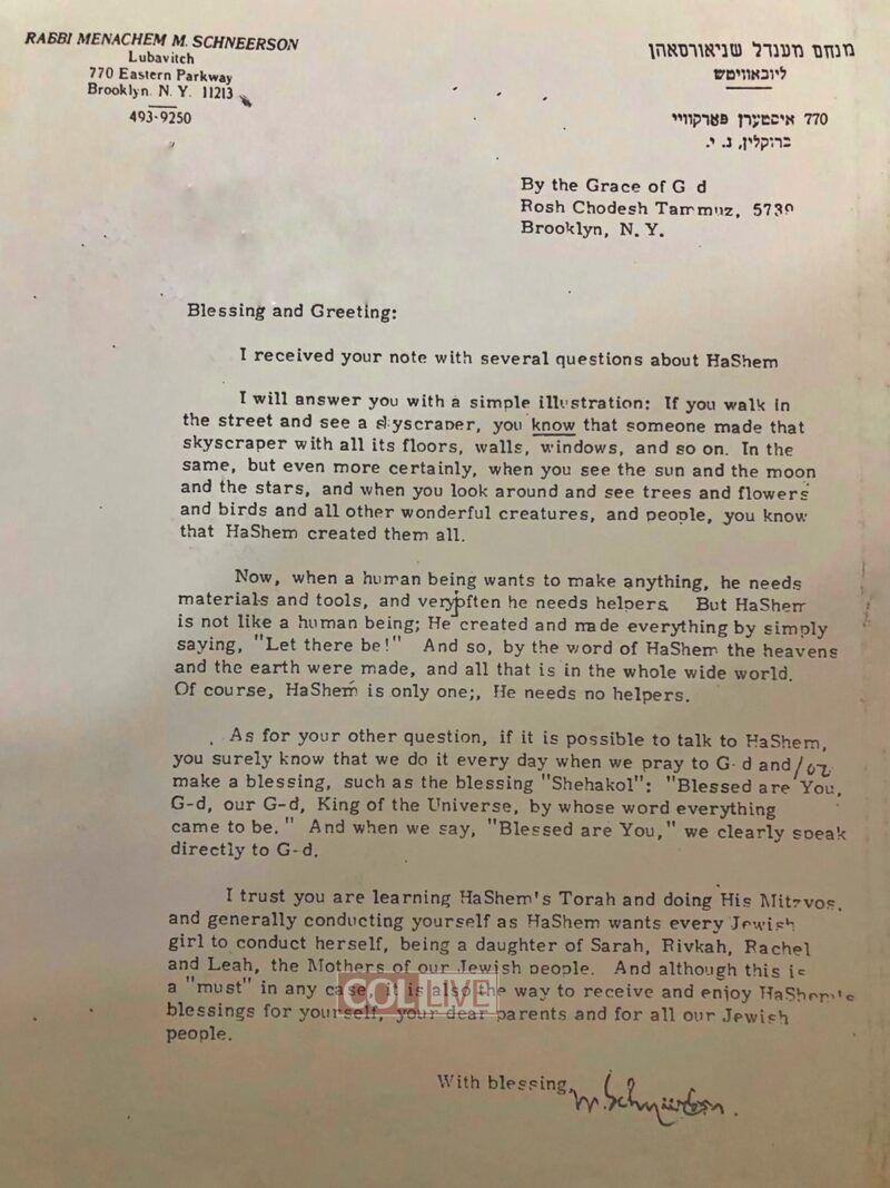 In 5739 a young girl wrote a letter to the Rebbe. In her letter the child asks the Rebbe several questions about G-d which were troubling her young mind.