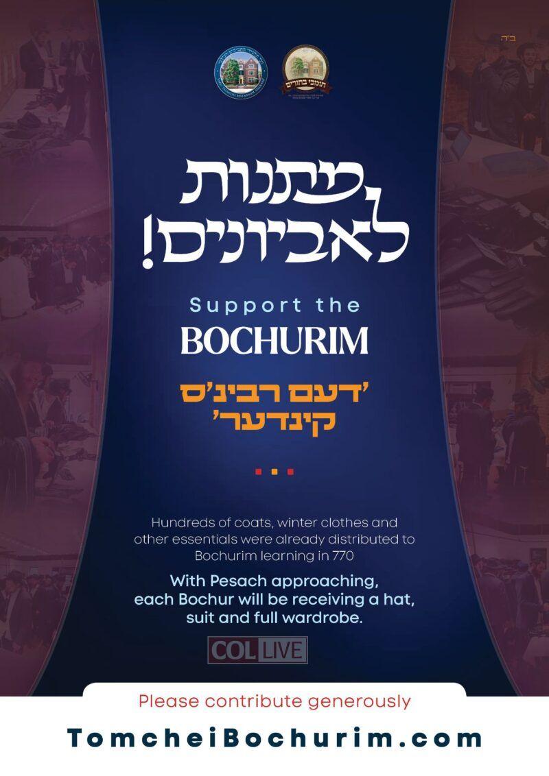 These needy Bochurim have nowhere else to turn and are completely relying on your generous contributions to bring in this Pesach as a Yid should, wearing a new suit and worrying only about their spiritual needs as a Bochur in the Rebbe’s Yeshivah.