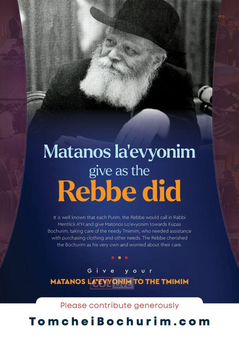 It is well known that each Purim, the Rebbe would call in Rabbi Mentlick A”H and give Matonos Lo’evyonim towards Kupas Bochurim, taking care of the needy Tmimim, who needed assistance with purchasing clothing and other needs. The Rebbe cherished the Bochurim as his very own and worried about their care.