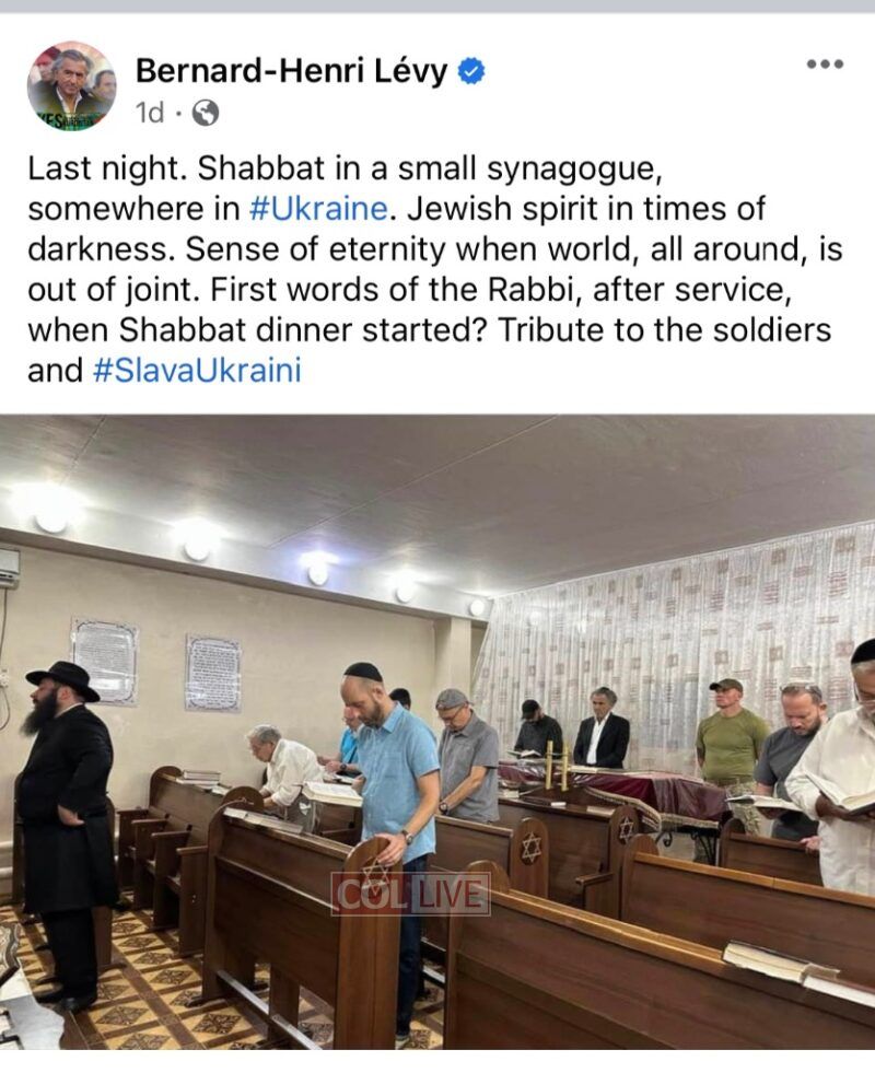 “Last night. Shabbat in a small synagogue, somewhere in #Ukraine. Jewish spirit in times of darkness. Sense of eternity when world, all around, is out of joint. First words of the Rabbi, after service, when Shabbat dinner started? Tribute to the soldiers and #SlavaUkraini.”