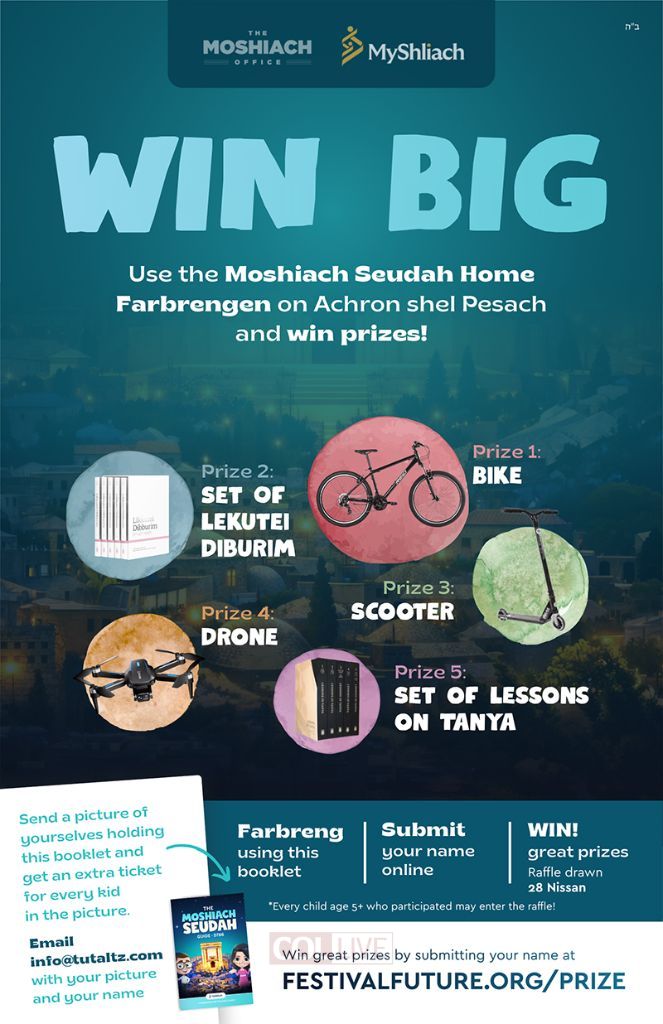 Over 4,000 families had the opportunity to participate in a tailor-made Moshiach Seudah experience through the Moshiach Seudah Family Home Program — a thoughtfully designed booklet created for Lubavitcher families. The initiative, a collaboration between Merkos 302’s MyShliach, the Moshiach Office’s Festival of the Future program, and the Merkos Chinuch Office, set out to bring the depth and feeling of Moshiach Seudah into every home.