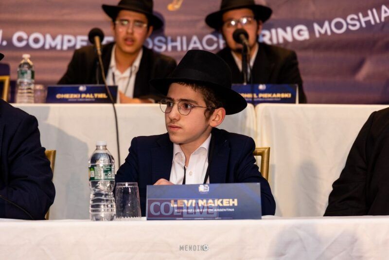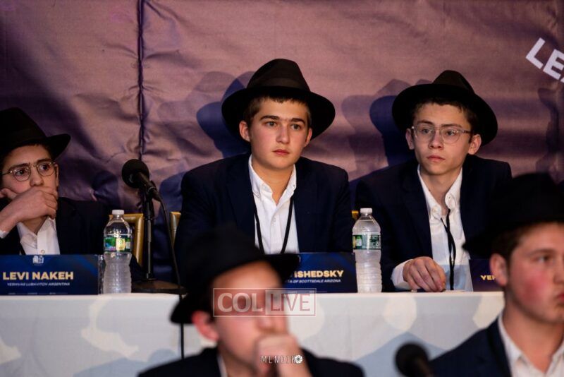 Stage representatives: Levi Nakeh from Yeshivas Lubavitch Argentina; Moshe Vishedsky from Lubavitch Mesivta of Scottsdale Arizona; Yehuda Leib Weitman from Yeshivas Lubavitch Brazil, Menachem Mendel Eidelman from Yeshiva Ketana Brunoy; Sholom Brashevitzky from Yeshivas Lubavitch Cincinnati; Mendel Mizrachi from Chovevei Torah; Yechiel Piekarski from Mesivta D’Suffield Connecticut; Mendel Sasonkin from Darchei Menachem; Gavriel Noach Halevi Levitin from Mesivta D’Kingston; Shlomo Posner from Yeshivas Ohr Elchonon Chabad Los Angeles; Menachem Mendel Lewis from Lubavitch Yeshiva Ketanah London; Zevy Brusowanken from Klurman Mesivta Miami; Avremel Leverton from Mesivta Lubavitch of Monsey; Eli Uminer from New Haven Mesivta; Shaul Yechezkel Paltiel from Oholei Torah Mesivta; Moshe Hershkop from Mayan Torah Pomona; Chaim Yisroel Sharf from Yeshivas Tomchei Temimim Queens; Shmaya Pruss from Mesivta Lubavitch Toronto; Yosef Deitch from Mesivta Menachem Westchester; and Mendy Andruseir from Bais Menachem Wilkes-Barre.
