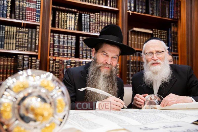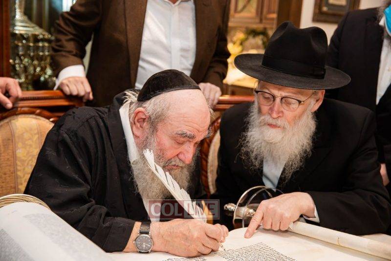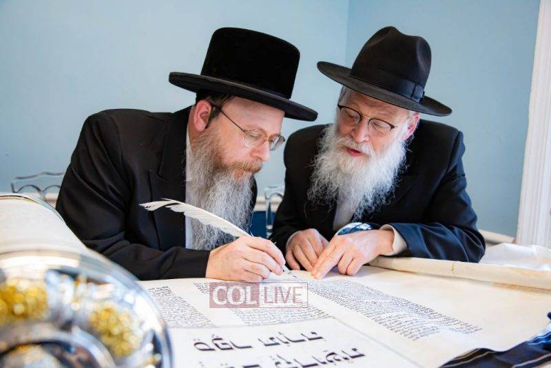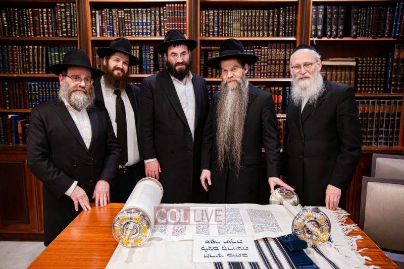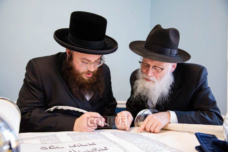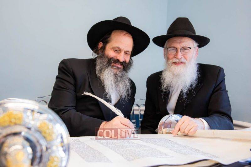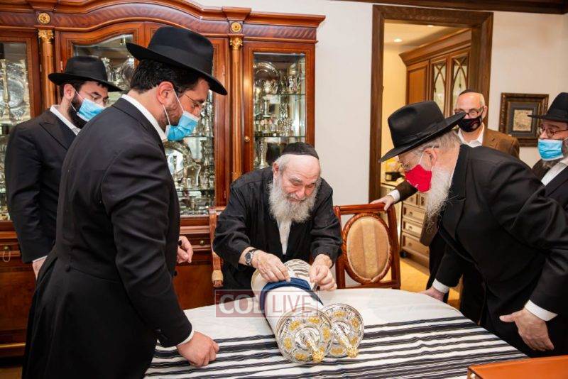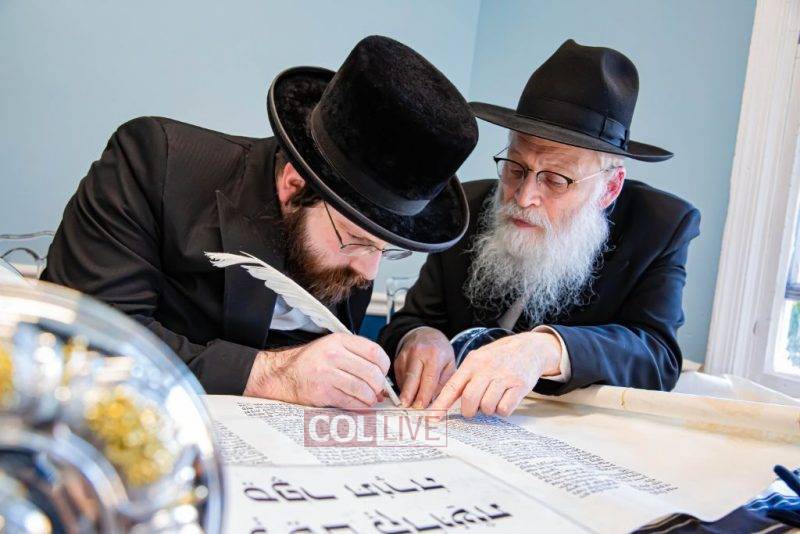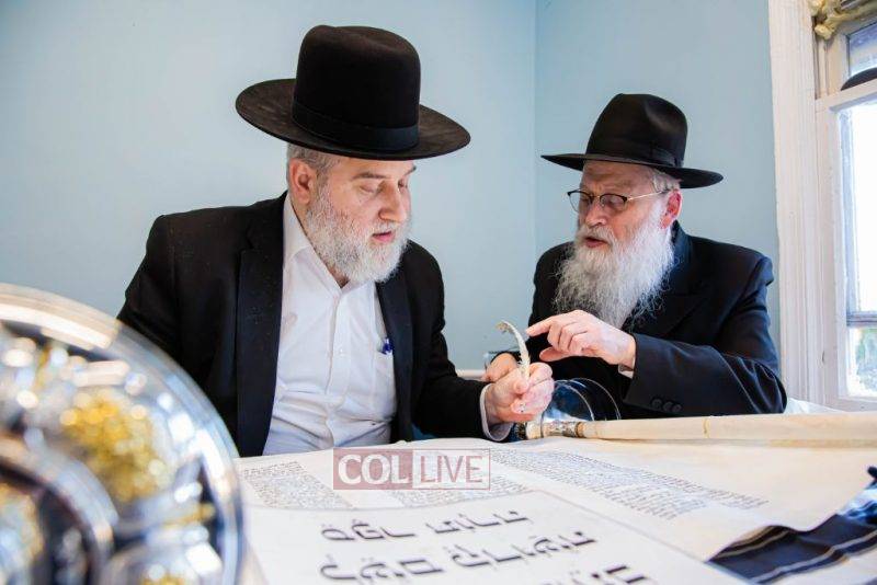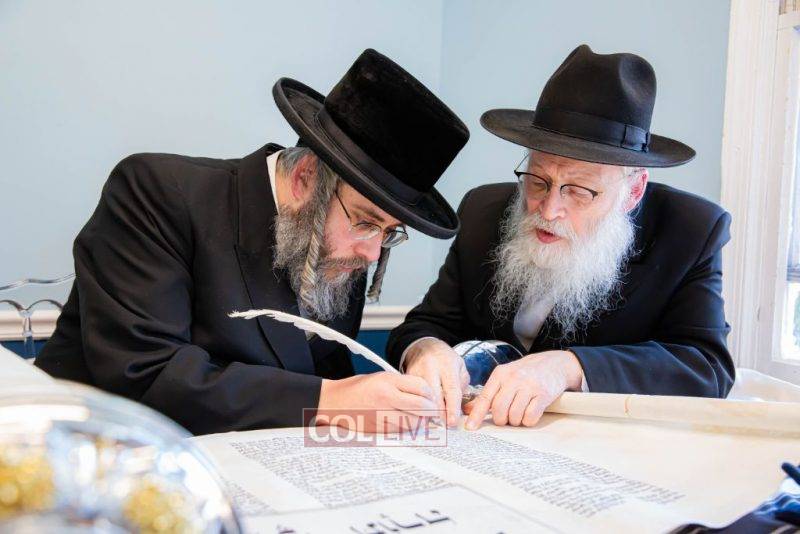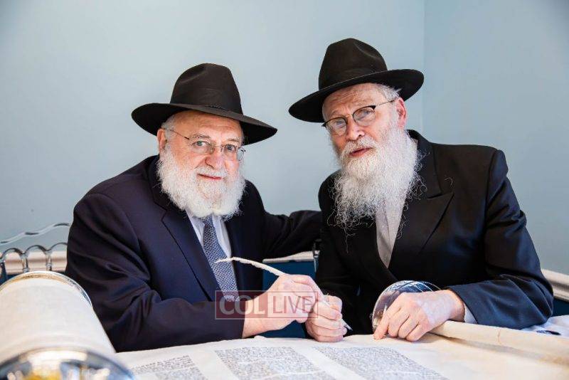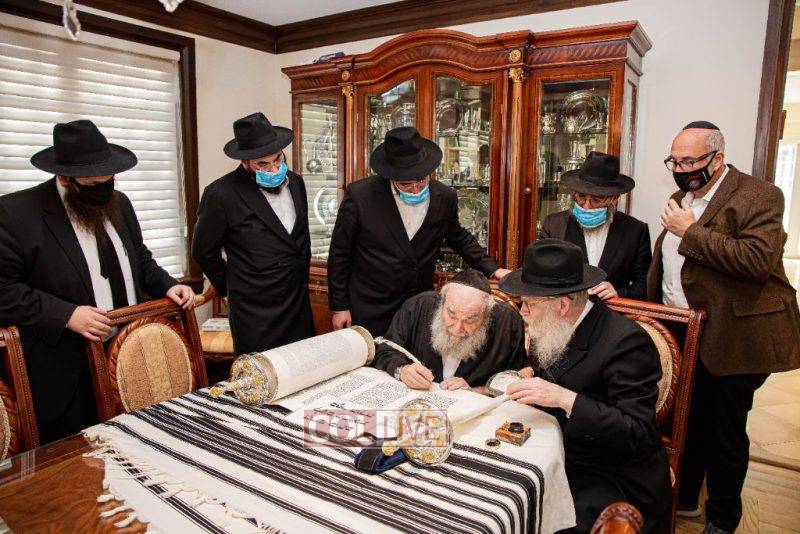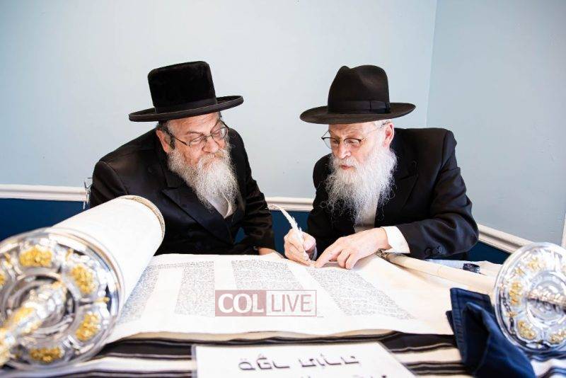 At an event at the Vorka Shul in Lakewood, NJ, respected Rabbonim and community leaders joined Sofer Rabbi Moshe Klein for a chance to inscribe a letter in the Torah which was begun during the start of the pandemic.