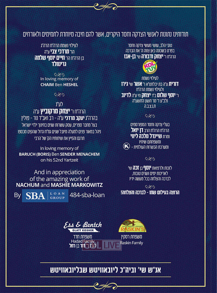 This year’s kiddushum are principally sponsored by Rabbi Yitzchok Raitport (in memory of his son), R’ Sholom Ber Drizin and family, R’ Yerachmiel and Rivkah Leah Jacobson and family, Rabbi Don Yoel Levy (in honor of his wife’s birthday and his daughter’s anniversary), the Steinberg families and the Davidov and Nachshanov families.