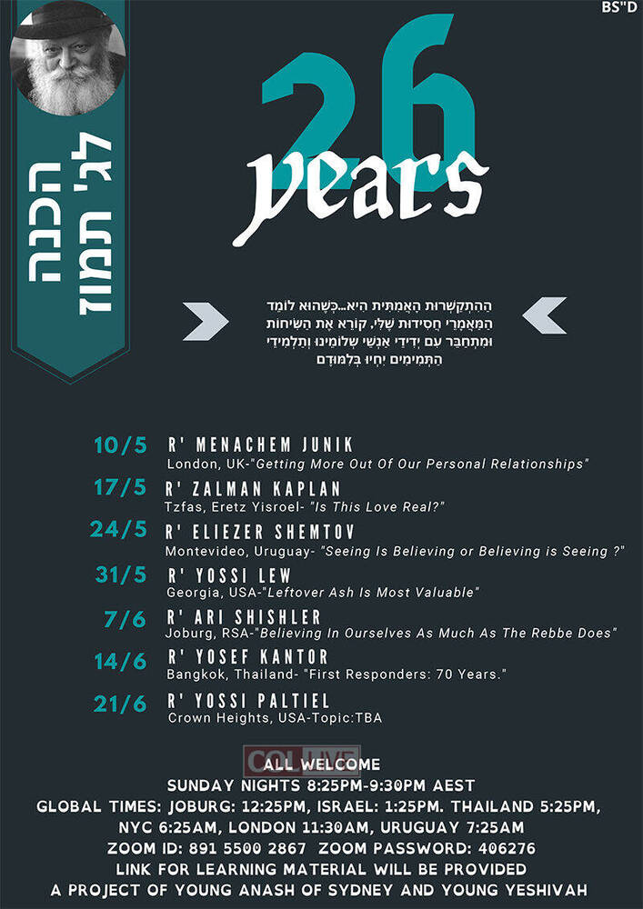 Beginning this Sunday, 10th May for 7 weeks, Shluchim from around the world will be giving a 1-hour shiur.